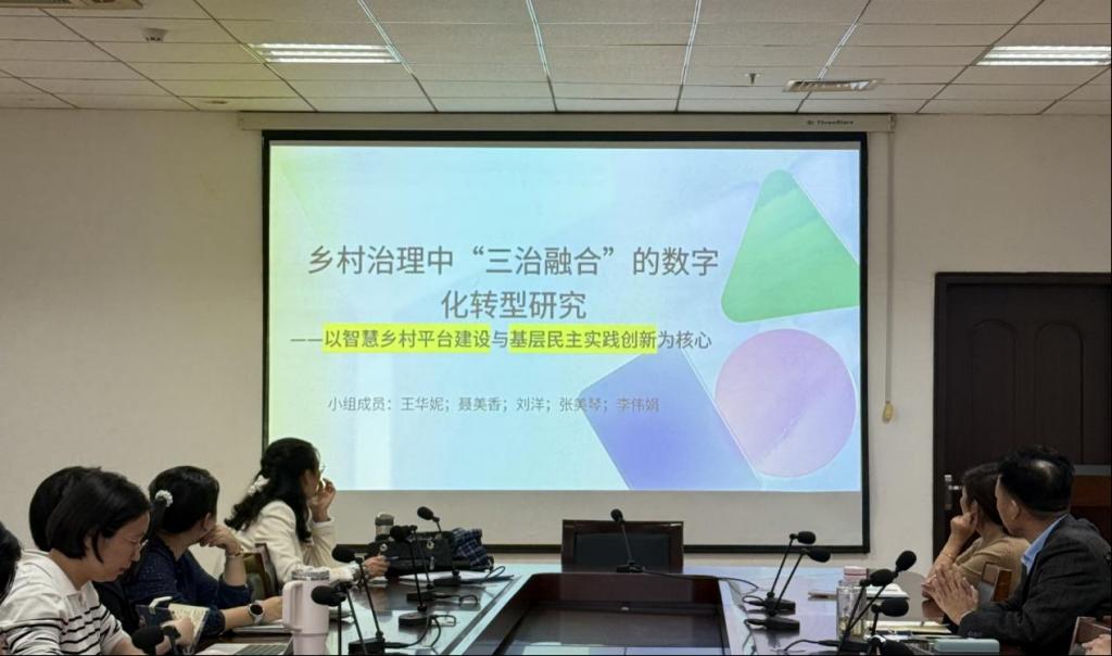 王华妮老师组深耕乡村治理数字化转型领域。李伟娟老师汇报课题《乡村治理中“三治融合”的数字化转型研究——以智慧乡村平台建设与基层民主实践创新为核心》,张美琴老师汇报论文《数字赋能下农民文化主体性提升:基于烟台市牟平区嵎峡河村的实践研究》,王华妮老师汇报论文《“三治融合”视域下农村“三资”治理的创新路径——以招远市大户陈家“统-分-统”模式为例》。