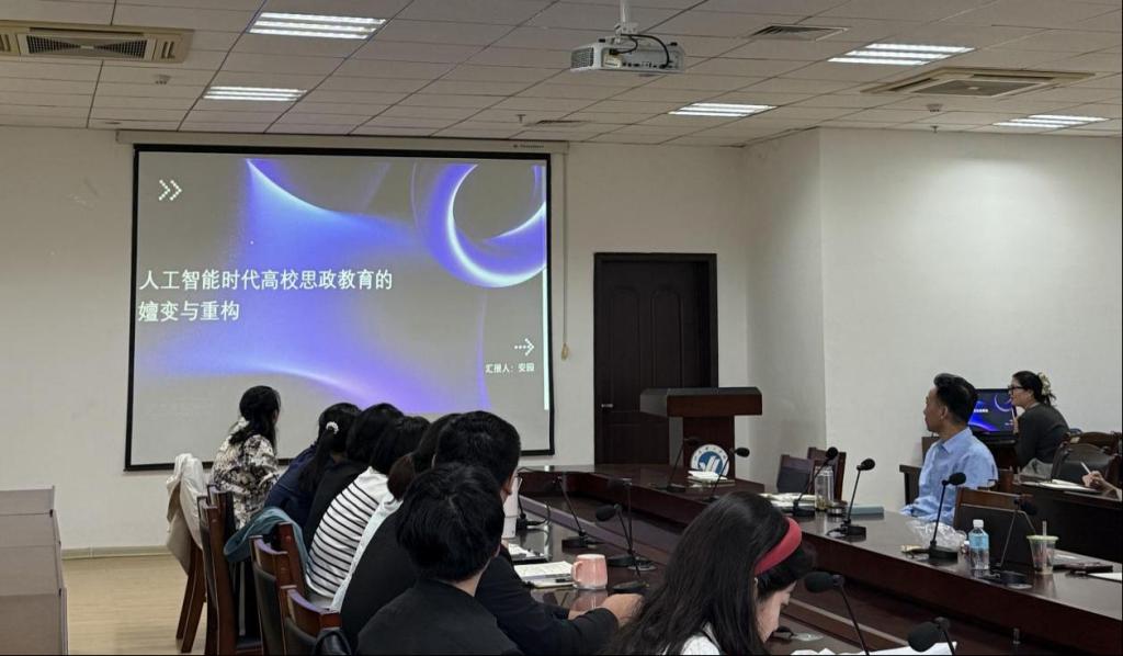 安园老师组聚焦人工智能时代高校思政教育变革。安园老师汇报课题《人工智能时代高校思政教育的嬗变与重构》、论文《他者的凝视:人工智能时代高校思政教师角色的异化研究》。林倩余老师围汇报论文《生成式AI在思政教育中的“价值观偏差”风险与规制路径研究》。