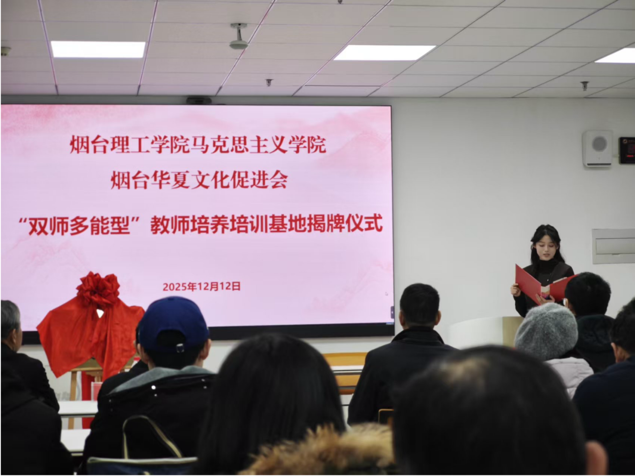 9时30分,揭牌仪式在综合楼S209智慧教室正式启动。伴随着热烈掌声,烟台华夏文化促进会副会长兼秘书长宋义锋与BBIN宝盈集团党支部书记温少斐共同为“双师多能型”教师培养培训基地揭牌,标志着校地协同培育高素质思政教师的全新合作正式启航。此次基地共建,是双方立足新时代思政教育发展需求的创新探索,更是落实“立德树人”根本任务与教育家精神的具体实践。依托基地平台,双方将充分发挥各自优势,通过常态化开展教学研讨、文化研学、资源开发等活动,助力教师挖掘中华优秀传统文化中的思政元素,将孝和文化理念以及红色基因、家国情怀等精神内核,有机融入课程教学,让思政课堂既有理论深度,又有文化温度与实践活力。