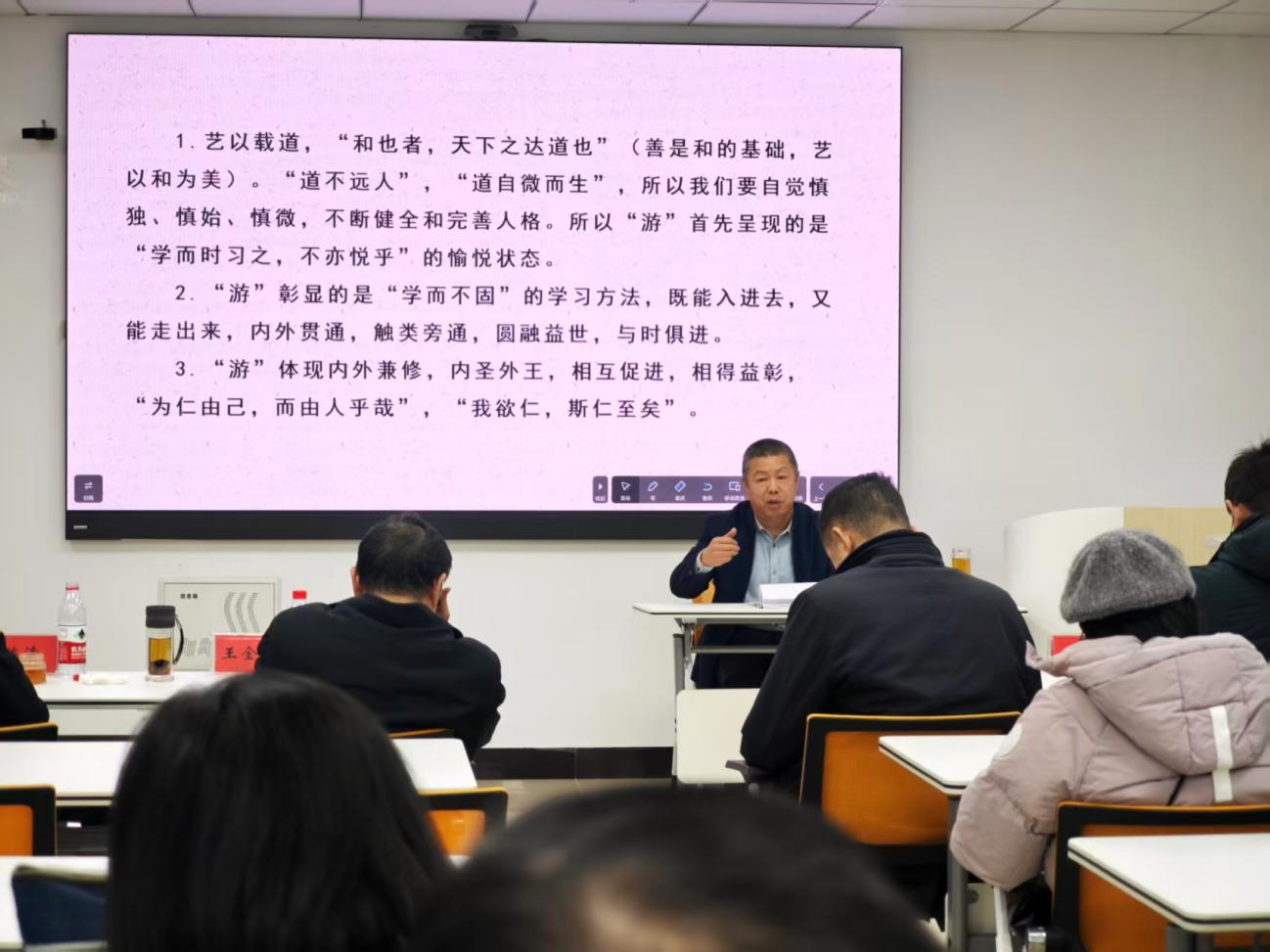 揭牌仪式后,济宁市中华文化促进会副会长、济宁市孝和文化博物馆与泗河文化博物馆馆长王万利以“孝和文化与基层精神建设实践”为核心,围绕“百善孝为先 家和万事兴”主题展开专题讲座。作为“党建引领·孝和治村”模式的探索者,王万利同志结合北王一村荣获“全国乡村治理示范村”“省级文明村”的实践经验,从“家”的溯源、注重“家庭”、注重“家教”、注重“家风”、实现“家兴”五个方面层层剖析,深入阐述中华传统美德的当代价值与实践路径,为思政课教师提供了传统文化与思政教学融合的新思路。