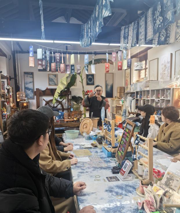 随后,党员教师们走进玖染布艺扎染工坊,沉浸式体验传统扎染非遗技艺。在工坊老师的指导下,大家亲手参与折叠、捆扎、浸染、固色等完整流程,将素净布料化作纹理独特、意蕴天成的扎染作品,在动手实践中感受植物染艺的千年智慧与布艺非遗的鲜活魅力。沉浸式体验让党员教师们真切体会到传统文化在当代的创新表达与活态传承,在指尖技艺中厚植文化自信。