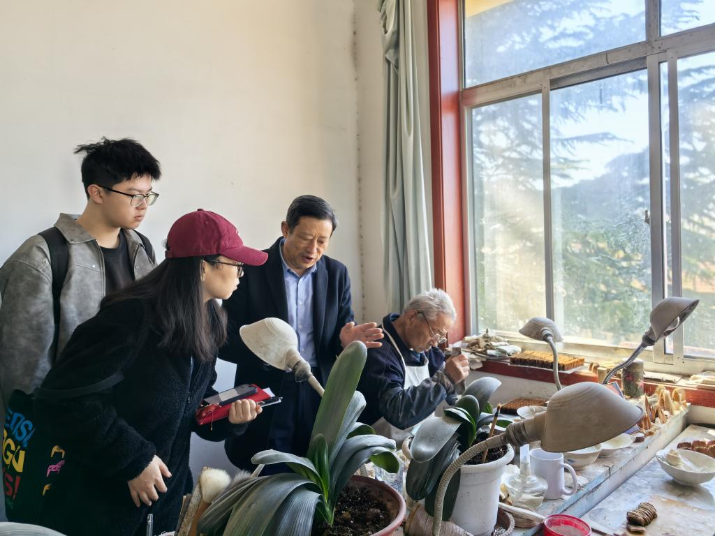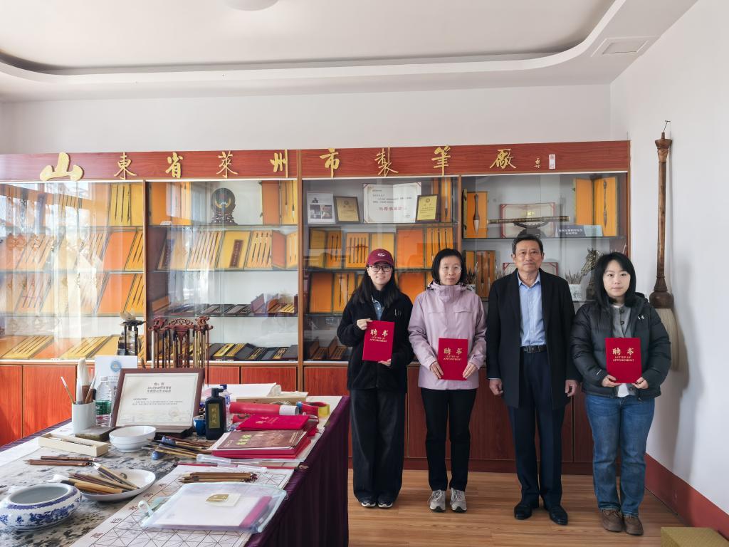 李厂长作为毛笔非遗传承人,深耕制笔技艺多余载,带领团队屡获殊荣:2010年获第五届全国民间工艺品博览会金奖;作品《泰岱翠峰》入选“山东手造·优选100”;推动莱州毛笔成为国家地理标志证明商标,所在工厂入选烟台市首届非遗工坊,让传统毛笔焕发新生的同时也兼具实用与艺术价值。双方围绕非遗技艺传承、品牌推广、青年传播等议题深入研讨,一致同意依托实践教学基地,发挥高校理论优势与非遗基地实践优势,用新媒体讲好非遗故事、传承红色基因,让非遗文化“活”下去,“走”出去。